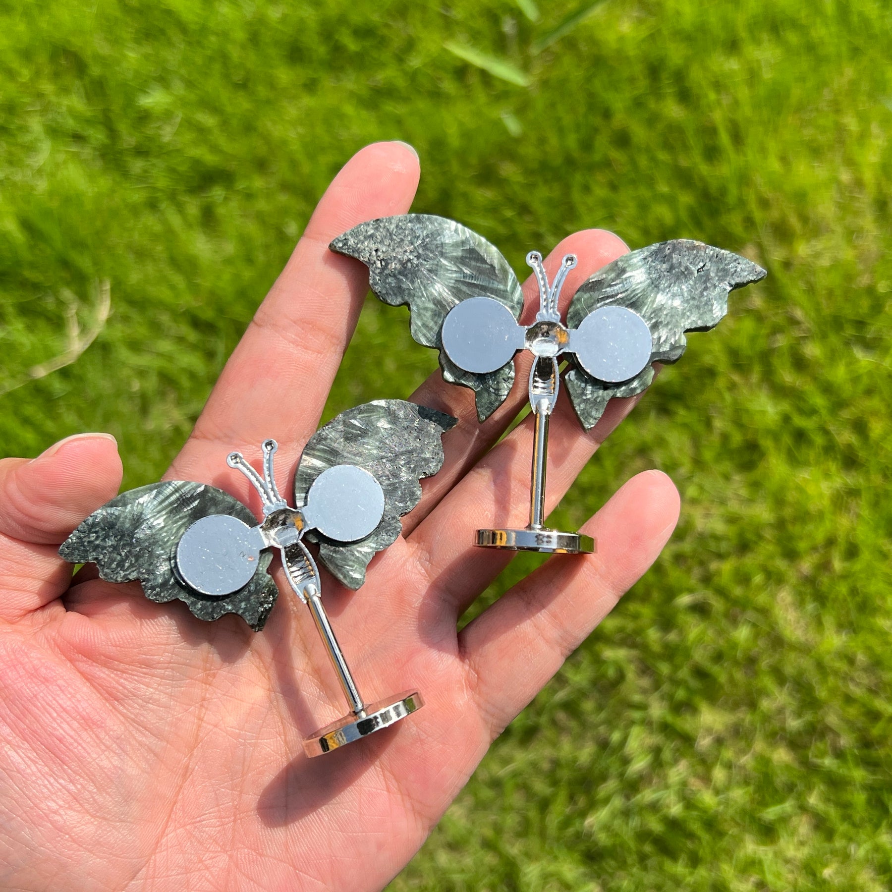 Crafted from natural seraphinite, these butterfly wings feature a stunning mix of dark - green and silver - gray patterns, like from a mystical forest 🌿🦋. Each is a unique art piece with delicate carvings, paired with a shiny metallic body and base.