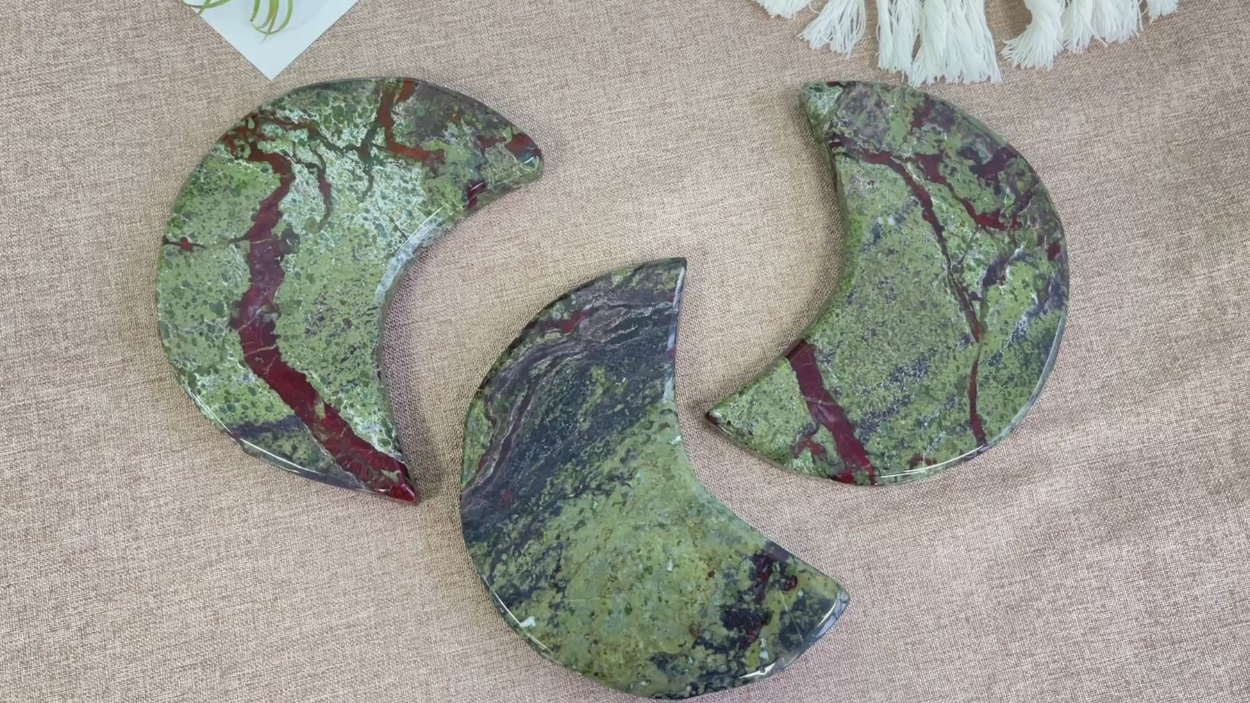 🌟Features:This is a piece of natural dragon blood stone shaped into a sleek moon silhouette—think rich, earthy green base swirled with bold red veins like mossy forest soil streaked with warm mineral tones 🌿. It comes with a sturdy black stand, making it easy to display as a striking focal point in any space.The design draws inspiration from two powerful elements: dragon blood stone’s grounding, revitalizing energy tied to strength and courage and the moon’s symbolism of emotional balance & intuition. Every moon has unique, dynamic vein patterns no two are identical, so yours will feel like a tiny, one-of-a-kind slice of nature’s bold beauty.