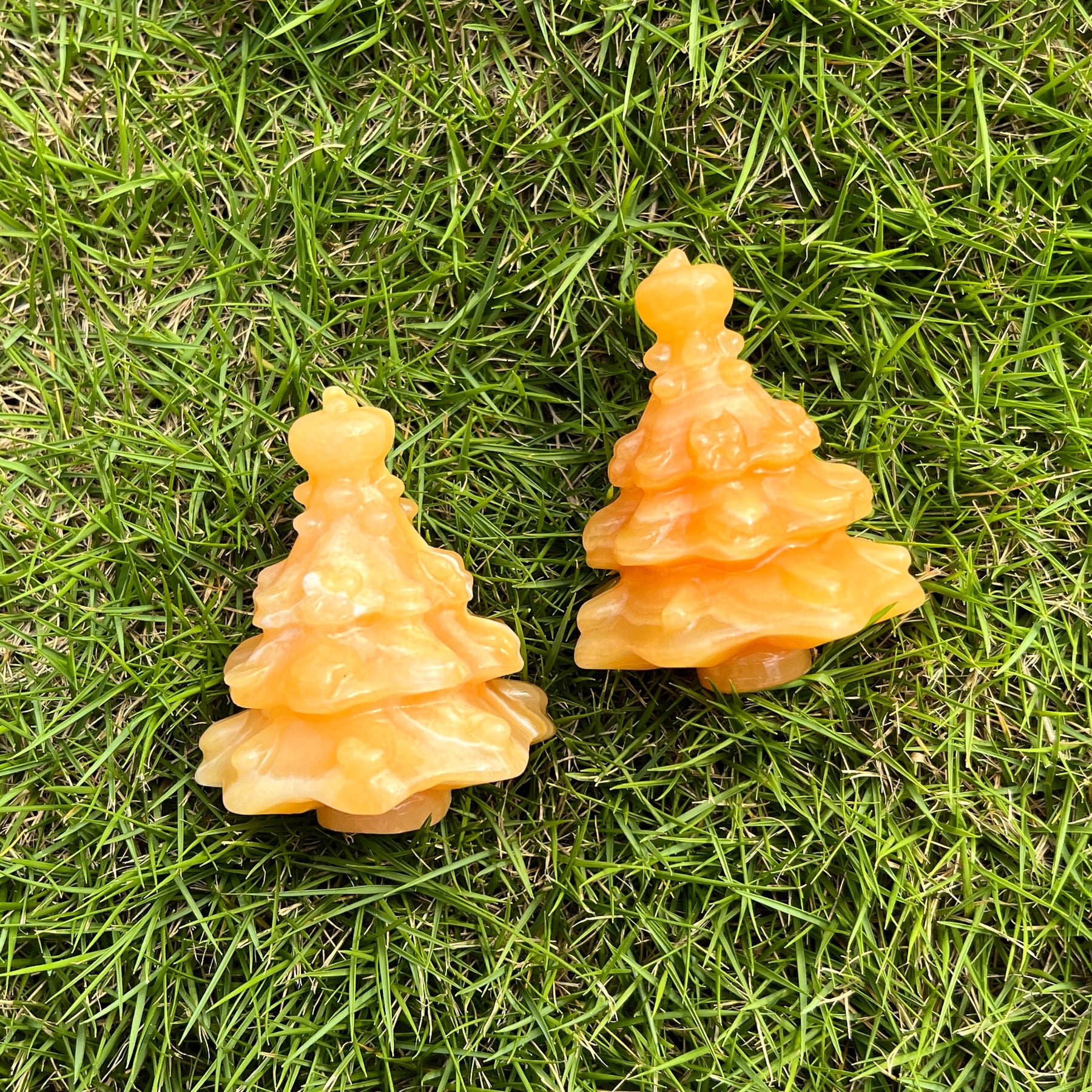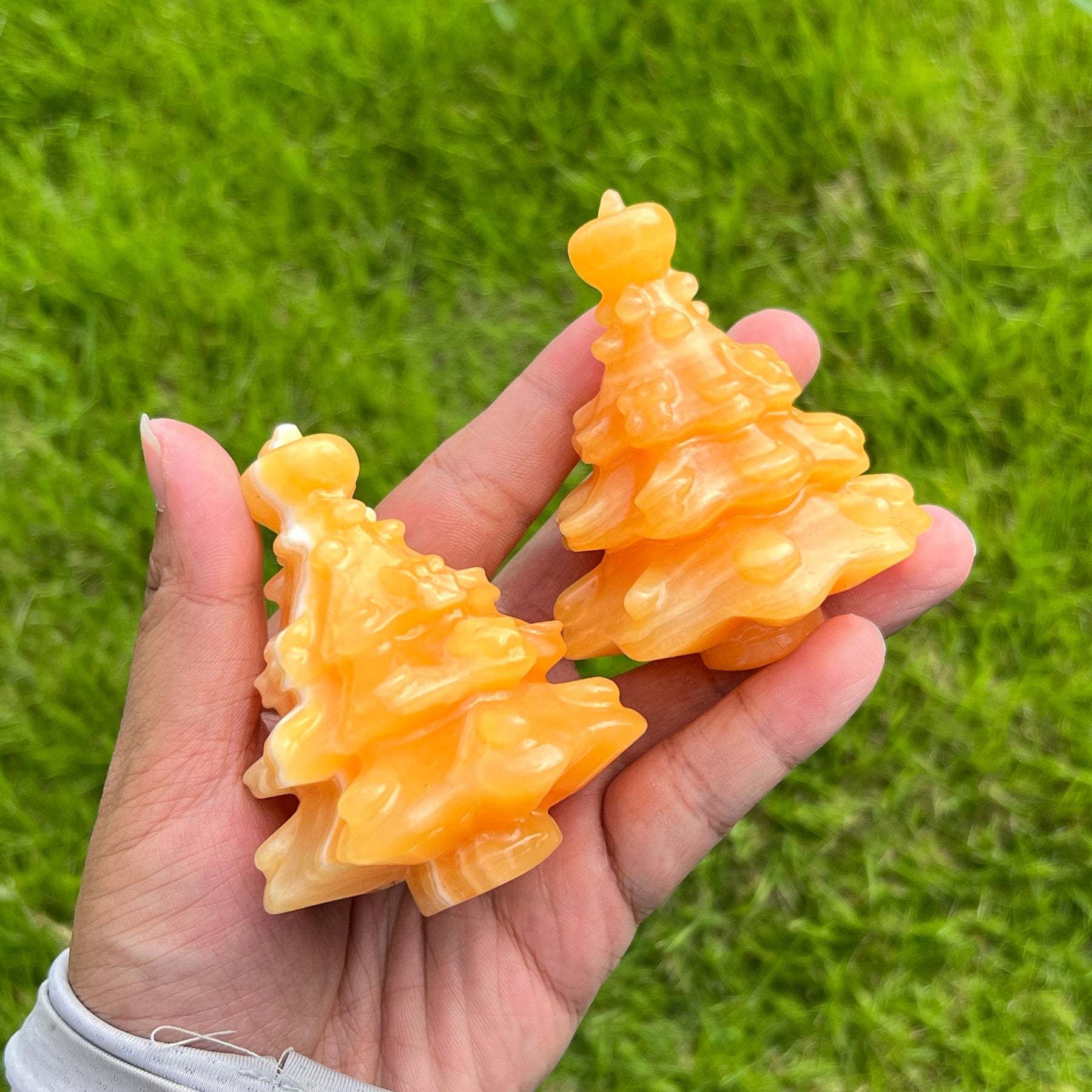 Hand - carved from natural Yellow Calcite,The warm, sunny yellow color, with its smooth and lustrous surface, sculpts a vivid and charming Christmas tree shape. It's like a piece of festive art, bringing a sense of joy and abundant energy to your space 🎄.