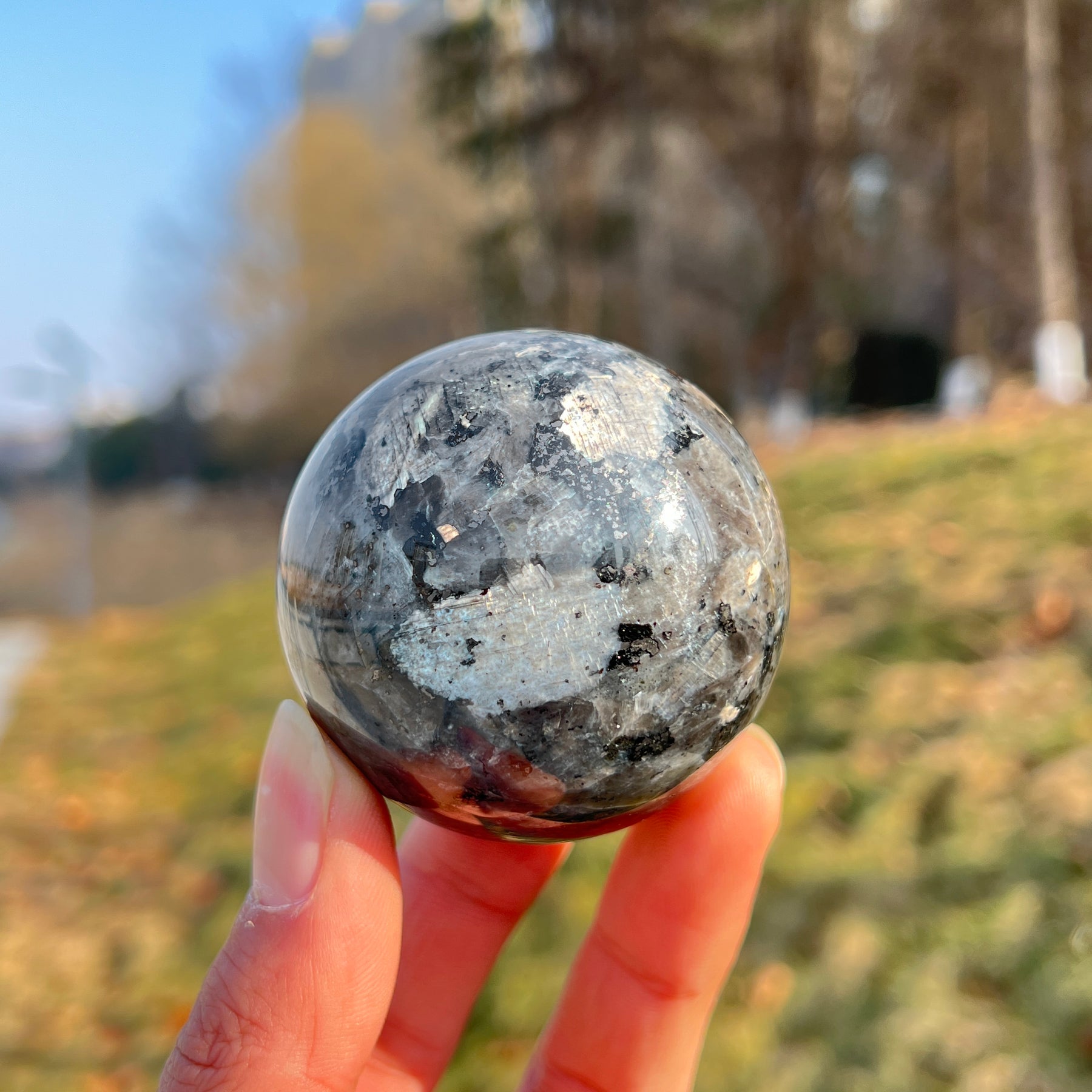 🌟Features:These striking, mysterious pieces are crafted from natural Larvikite—a mineral with a deep, silvery-gray base swirled with iridescent blue and black inclusions that resemble a starry night sky ✨. They are shaped into perfectly smooth spheres that fit comfortably in the palm, creating a tangible symbol of protection and inner strength.Inspired by the sphere’s symbolism of wholeness, balance, and cosmic connection,this design blends grounding energy with celestial beauty: the dark hues evoke the depth of the universe, while the iridescent details mirror the magic of hidden potential and inner light.